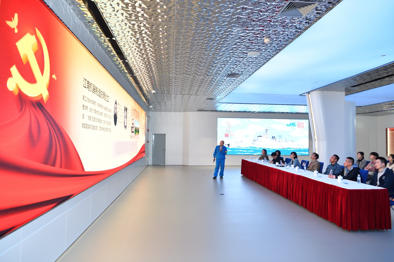 朱书记为师生们介绍了江南造船所建造的代表性船型,以及江南造船厂在上岛以来十年多时间取得的长足发展,并为师生们详细介绍了江南造船的地理位置、厂区布置等内容。通过朱煜书记的详细讲解,随行师生切身感受到国家海军装备力量的强大,由衷地“为祖国感到骄傲”。