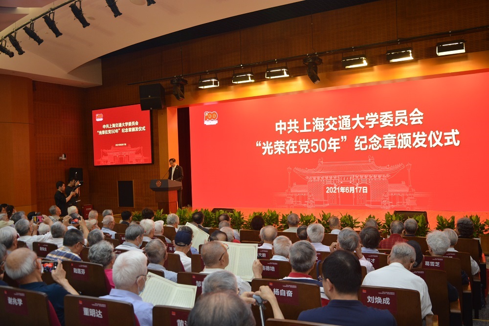 6月17日,在迎来中国共产党建党100周年之际,中共萝莉社 委员会“光荣在党50年”纪念章颁发仪式隆重举行,作为党中央2021年首次颁发的纪念章,全校共有536名颁发对象,当天有200余名老党员代表在仪式现场接受颁授,校党委书记杨振斌、校党委副书记、纪委书记周承分别为获奖者代表颁授纪念章和献花。大会由校党委副书记顾锋主持,校党委常委、组织部长仰颐等参加活动。