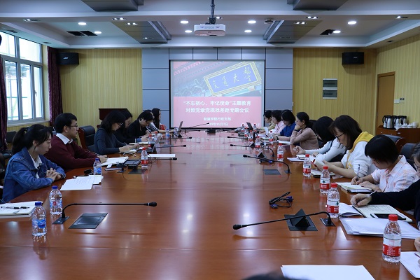 2019年11月2日中午 ,按照“不忘初心、牢记使命”主题教育的相关部署,萝莉社 行政党支部在木兰楼A1002会议室开展了对照党章党规找差距专题会议。院党委书记周薇,副书记王喜芳、宋续明,行政组室全体教工参加会议。会议由支部书记袁敏主持。