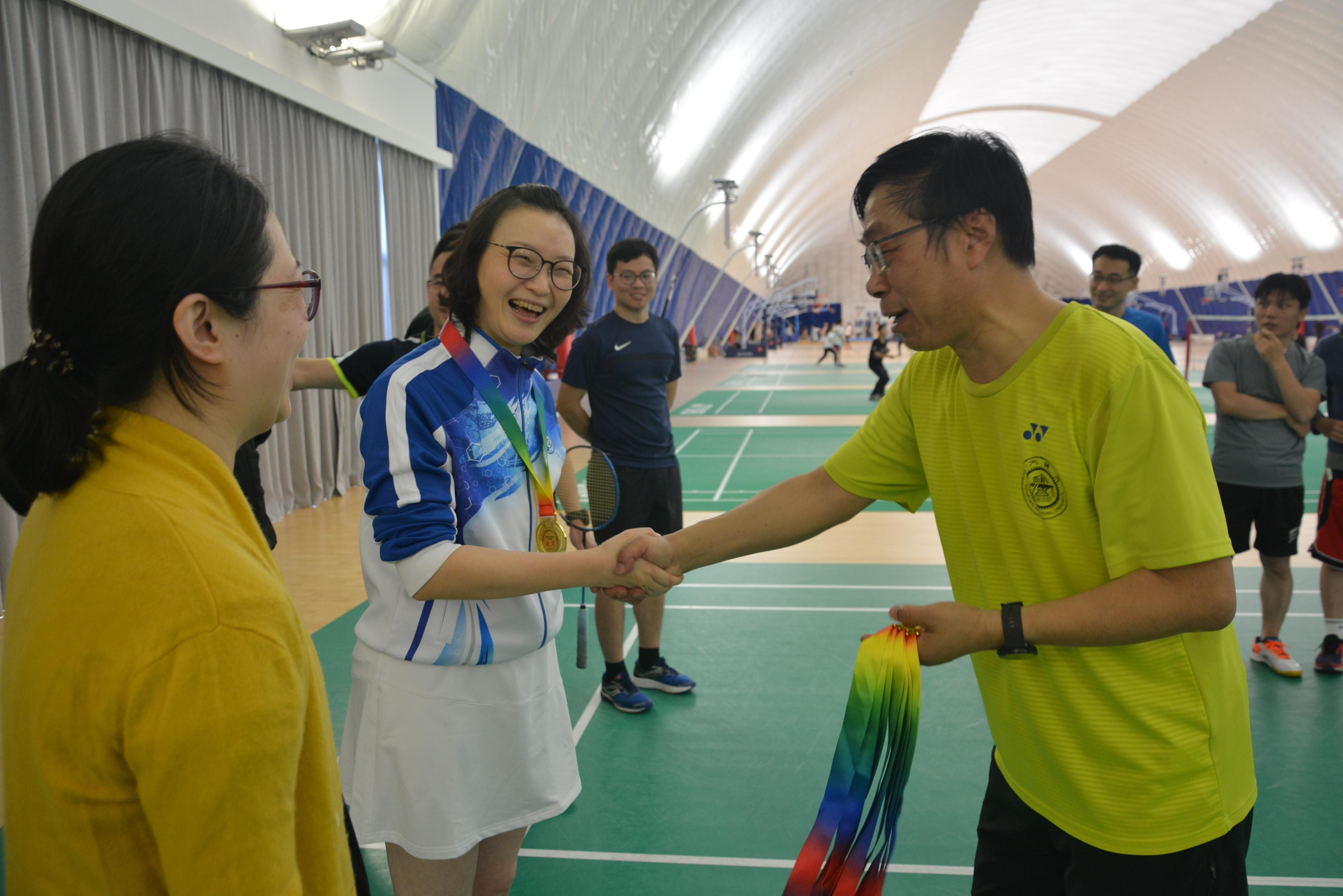 之后是“五羽轮比”趣味赛,由张卫刚、王喜芳、薛鸿祥和赵金城四位老师领队,现场招募选手组成四支五人组队伍,按照“五羽轮比”规则,一方获得10分后双方各替换一名选手进入下一局,以此类推,直到赢得50分。经过激烈的角逐,由薛鸿祥和张卫刚带领的队伍分别获得趣味赛第一、二名,赵金城和王喜芳带领的队伍分别获得三、四名。