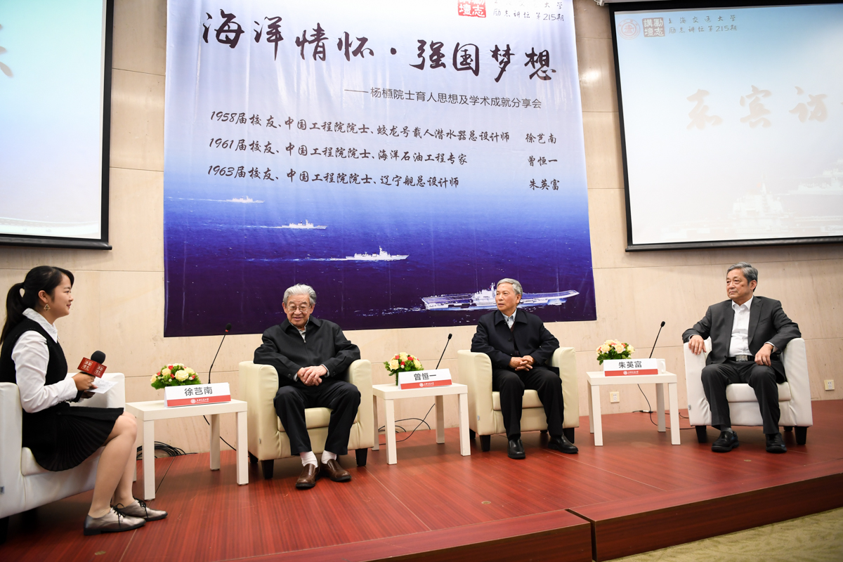 10月17日下午,杨槱院士育人思想及学术成就分享会在上海交大举行。上海交大1958届校友、蛟龙号载人潜水器总设计师徐芑南,1961届校友、海洋石油工程专家曾恒一,1963届校友、辽宁舰总设计师朱英富三位重量级嘉宾做客上海交大励志讲坛开讲。他们既是中国工程院院士、萝莉社 杰出校友,也是杨槱先生的学生。三位“中国脊梁”和交大学子分享了杨槱这位中国教育界和船舶工程领域大师不平凡的人生轨迹,并讲述了我国一代代“海洋人”的蓝色情怀和筚路蓝缕的报国故事。