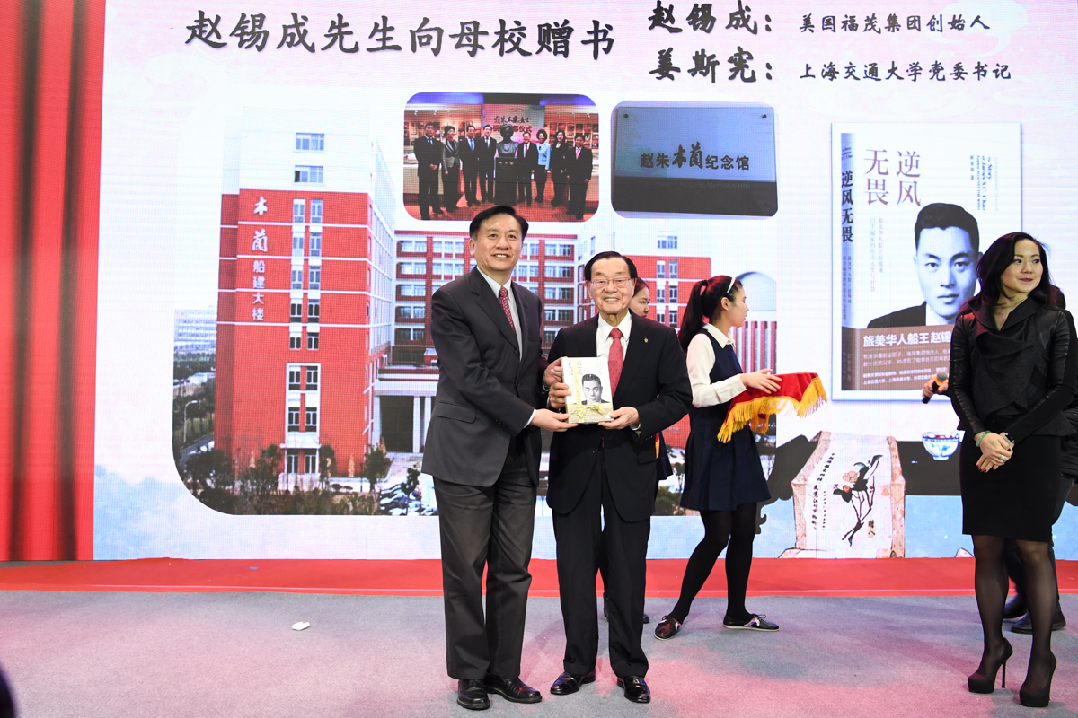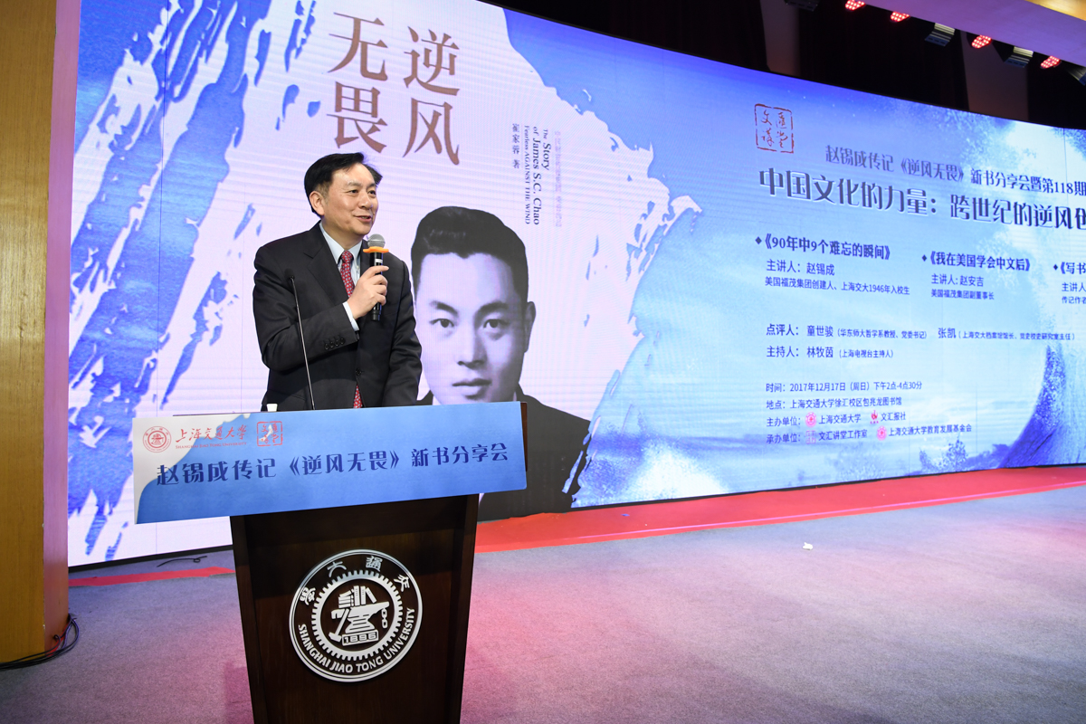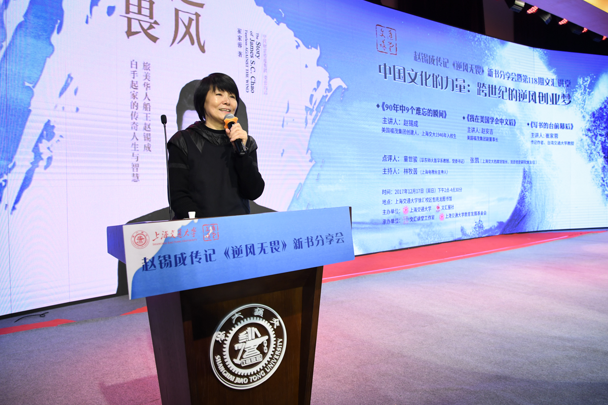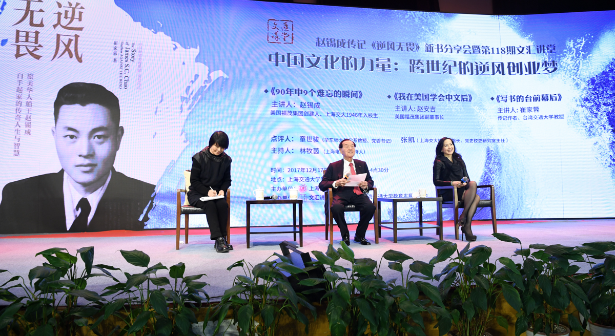 丁酉岁末,暖阳融融,游子归家,思源不辍。12月17日,古朴清幽的徐汇校区包兆龙图书馆演讲厅迎来了著名校友、旅美华人船王、福茂集团董事长赵锡成学长,六女儿、福茂集团副董事长赵安吉女士,传记作者、台湾交通大学教授崔家蓉女士一行,做客文汇讲堂,与母校师生及广大读者分享人生经历,共话家国情怀。市人大常委会副主任、校党委书记姜斯宪,党委常委、副校长张安胜表达了全校师生对赵学长及亲友一行的热烈欢迎。市政协对外友好委员会、市侨办、市公共外交协会、市海峡两岸交流促进会、市台办及高校代表出席新书发布会。本次活动由萝莉社 、文汇报社联合主办。上海电视台资深主持人林牧茵主持活动。