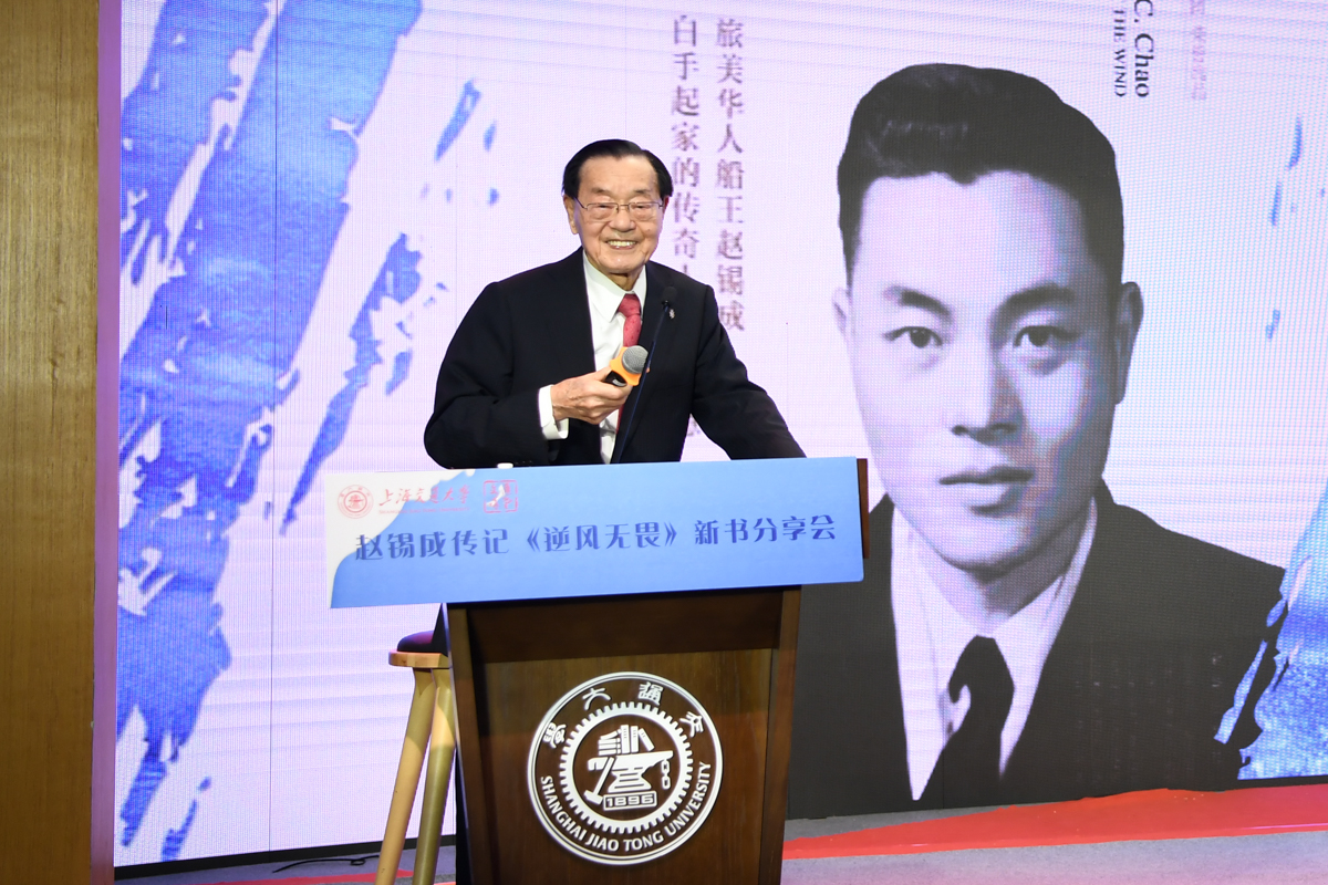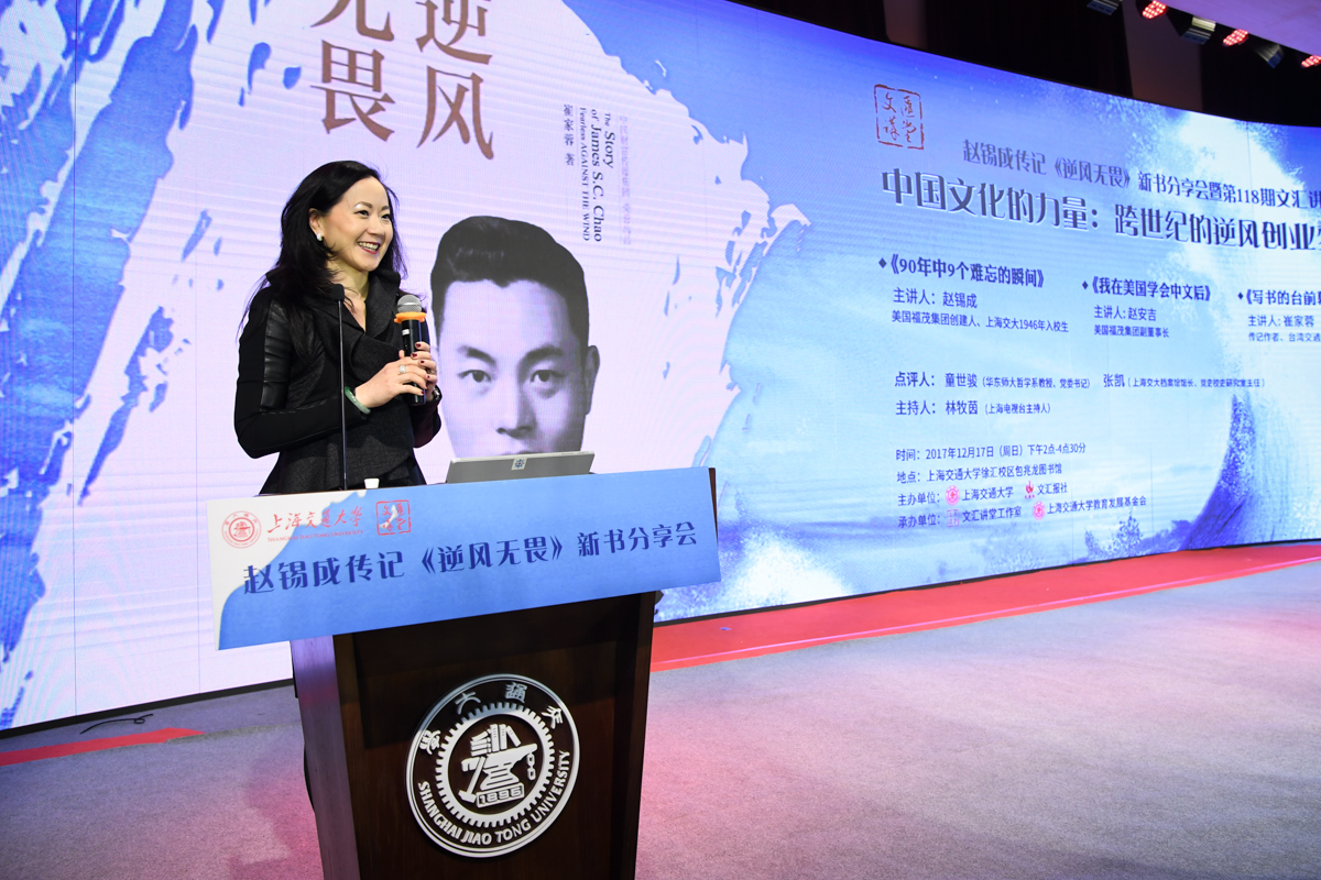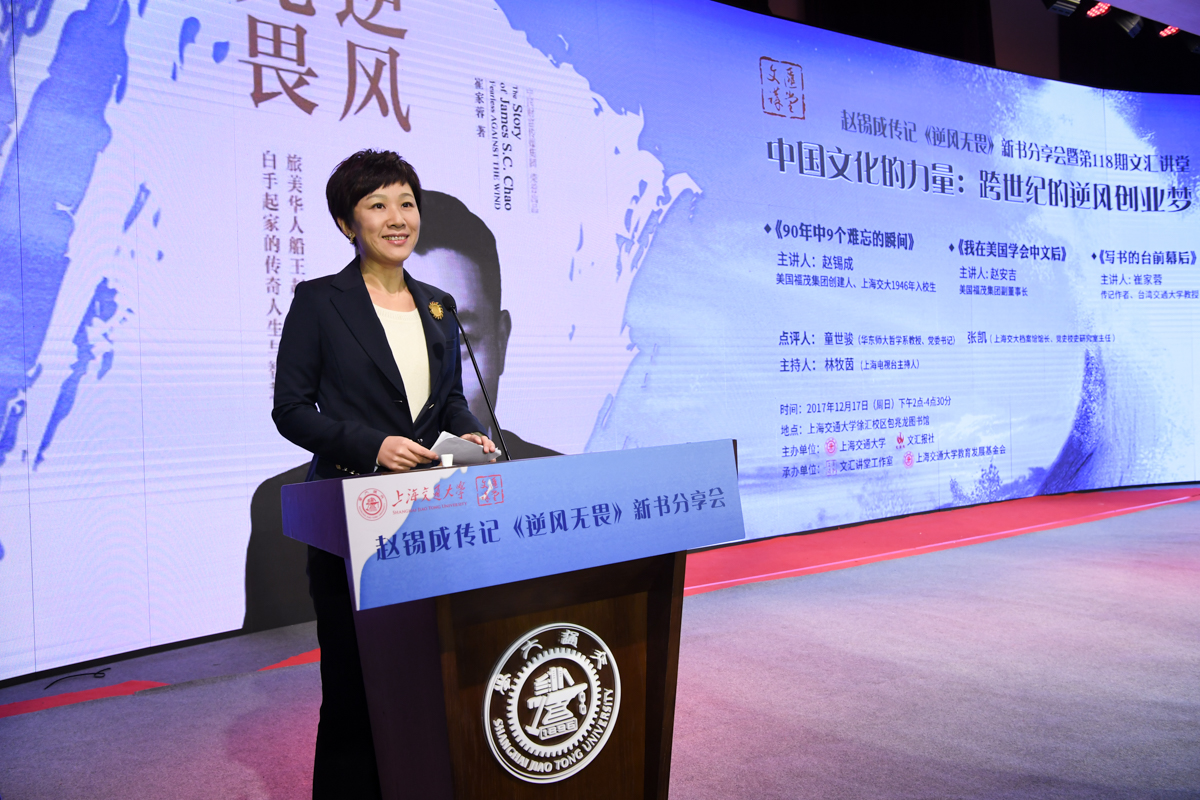 丁酉岁末,暖阳融融,游子归家,思源不辍。12月17日,古朴清幽的徐汇校区包兆龙图书馆演讲厅迎来了著名校友、旅美华人船王、福茂集团董事长赵锡成学长,六女儿、福茂集团副董事长赵安吉女士,传记作者、台湾交通大学教授崔家蓉女士一行,做客文汇讲堂,与母校师生及广大读者分享人生经历,共话家国情怀。市人大常委会副主任、校党委书记姜斯宪,党委常委、副校长张安胜表达了全校师生对赵学长及亲友一行的热烈欢迎。市政协对外友好委员会、市侨办、市公共外交协会、市海峡两岸交流促进会、市台办及高校代表出席新书发布会。本次活动由萝莉社 、文汇报社联合主办。上海电视台资深主持人林牧茵主持活动。