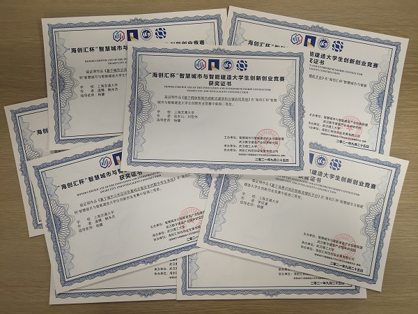 2021年9月25日,“海创汇杯”智慧城市与智能建造大学生创新创业颁奖仪式于在武汉“2021智慧城市与智能建造高端论坛”上顺利召开。该竞赛是在湖北省高等教育学会工程管理与智能建造教育分会指导下,由丁烈云院士任指导委员会主任,由智慧城市与智能建造产业创新联盟、武汉数字建造产业技术研究院主办,武汉理工大学承办。上海市公共建筑和基础设施数字化运维重点实验室学生科创团队,在杨健教授的指导下参加了本次比赛,并获二等奖一项,三等奖两项。