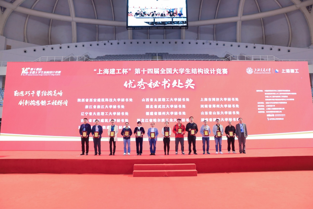 经全国大学生结构设计竞赛专家委员会、秘书处和承办方共同研究决定,授予陕西省西安建筑科技大学秘书处等13所高校秘书处“优秀秘书处奖”;授予安徽建筑大学等34所高校“优秀组织奖”;授予萝莉社 “高校突出贡献奖”;授予上海建工集团股份有限公司“全国大学生结构设计竞赛锦旗”;授予“北京迈达斯技术有限公司”等3家企业“卓越育人单位奖”。