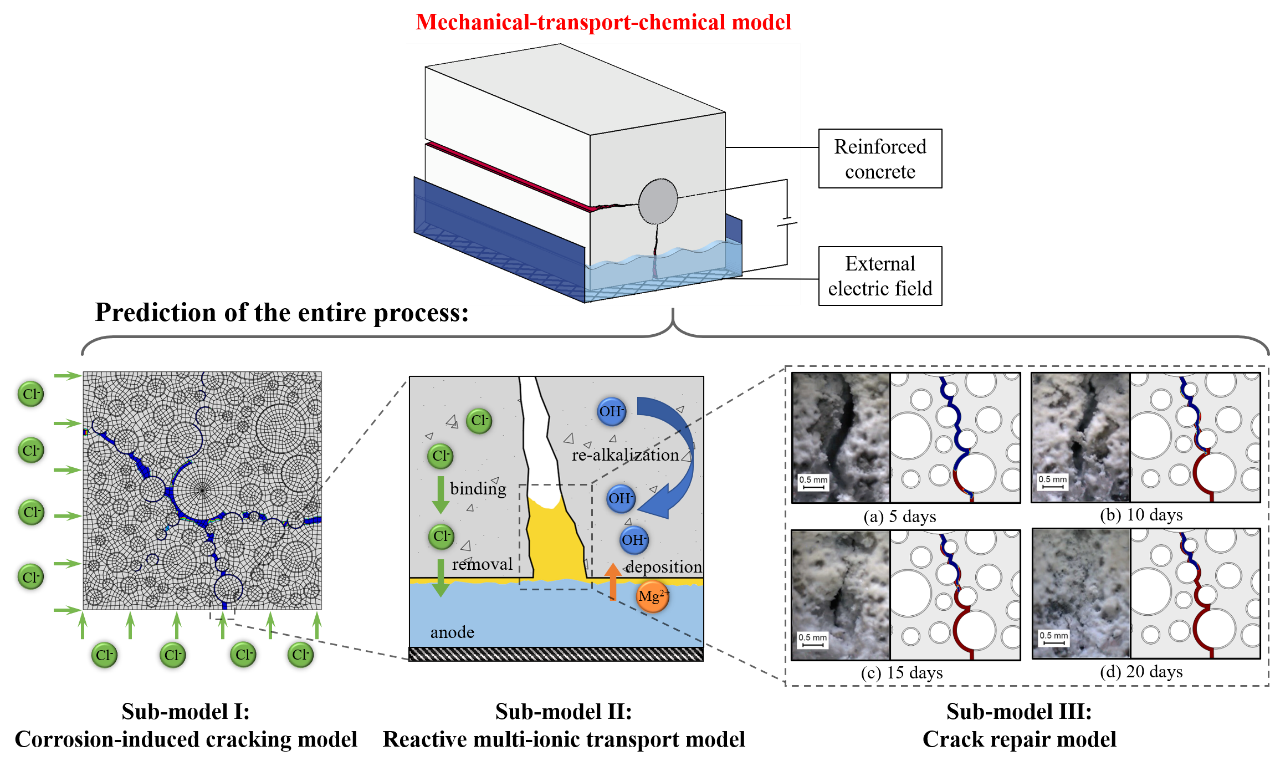 近期,萝莉社 土木工程系2020级硕士研究生孟昭铮在钢筋混凝土结构电化学修复机理研究及全寿命周期预测上取得创新性成果。相关成果以“Mechanical–transport–chemical modeling of electrochemical repair methods for corrosion-induced cracking in marine concrete”和“Electrochemical deposition method for load-induced crack repair of reinforced concrete structures: A numerical study”为题分别发表于土木工程领域顶级期刊《Computer-Aided Civil and Infrastructure Engineering》和结构工程领域标志性刊物《Engineering Structures》(均为交大A档期刊)。两篇论文的第一作者为孟昭铮,通讯作者为其导师刘清风教授。