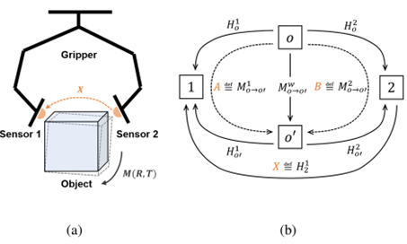 受上述内容的启发,并且在视触觉传感器领域长期研究的基础上,课题组针对该问题建立了理论模型并提出了解决该问题的算法框架。所提出理论的核心是:当每个手指都装备有触觉传感器的多指机械手抓取一个几何形状未知的物体时,每个手指的触觉测量数据都可以单独估计被抓取物体的刚体运动,而不同手指的估计结果应当一致对应于被抓取物体在世界坐标系下的唯一刚体运动。这种共享的刚体运动为求解多个触觉传感器之间的相对位姿关系提供了必要的运动约束方程,并可以进一步被简化为AX=XB