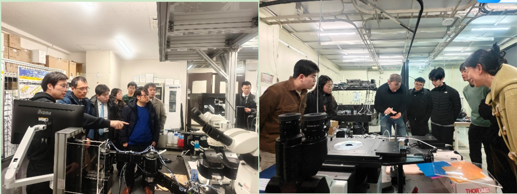 团队成员集体参观了东京大学流体力学实验室与生物机器人实验室。Mouterde教授向交大团队详细介绍了其在固液界面领域的研究成果,揭示了微观结构对液滴行为的影响;Mouterde教授亲自演示了在液滴表面吸附特殊材料后,液滴将保持球形的疏水状态自由滚动的特点;MinHyeok Lee教授详细介绍了其在燃烧现象研究、碳中和技术以及热电系统开发方面的研究成果;Yaerim Lee教授的研究方向包括:纳米技术与材料、热反射膜、液滴行为与相变过程等;Venture教授的实验室主要从事机器人领域的研究,教授及实验室成员介绍了其在机器人控制器开发、人脸追踪、路障规避等领域的研究成果,并进行了现场演示;新井教授向团队从系统架构、数据集成到具体应用场景多方位介绍了生物实验室自动化生产线的技术实现,并深入剖析了自动化实验室对提升实验效率、减少人为实验误差的意义。双方就相关领域展开了详细讨论,现场讨论氛围热烈。
