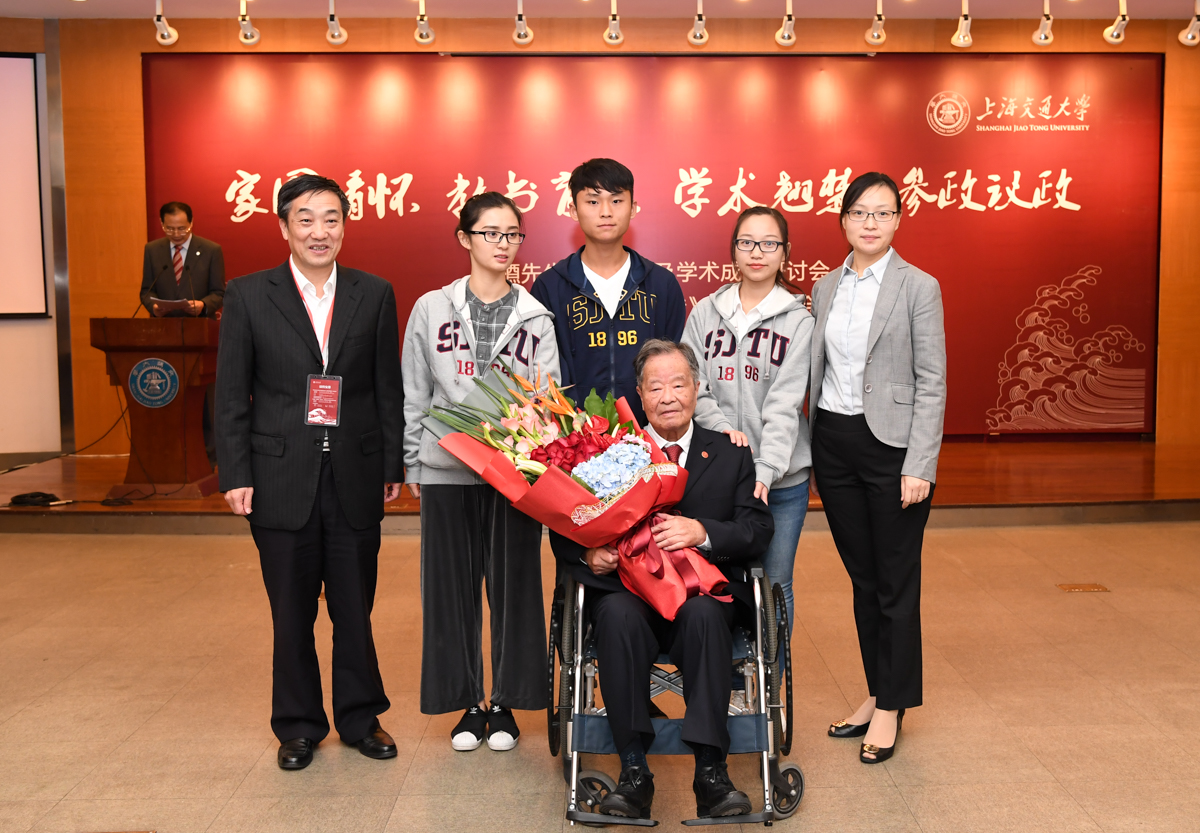 杨槱先生指导过的学生们和交大学子们分别献上精心准备的鲜花,表达对杨先生的深深敬意,并祝福今年百岁的杨先生身体健康、寿比南山。杨槱先生高兴地与学生们合影留念。