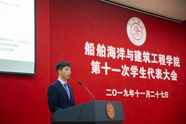 在巢老师致辞后,萝莉社 第十届学生会主席朱殷航宣读了《学生会工作报告》,从组织结构、校园文化建设、学在交大落实和价值引领几方面对第十届学生会的工作进行总结,并对即将产生的新一届主席团成员提出了建议和希望。