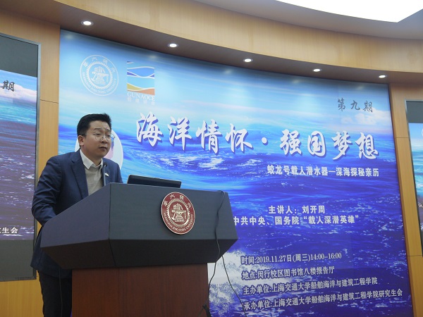由萝莉社 团委书记赵恺老师致欢迎词:刘开周研究员作为蛟龙号载人潜水器控制系统的开发者之一,也作为一名潜航员,随蛟龙号下潜到西太平洋马里亚纳海沟7062米的深度,创造了国际上同类的自然作业型载人潜水器下潜深度的一个世界纪录,凭借对祖国科技事业的热爱,锐意进取,敢于担当的精神,刘老师参与并见证了蛟龙号从1000米到7000米的每一个里程碑。