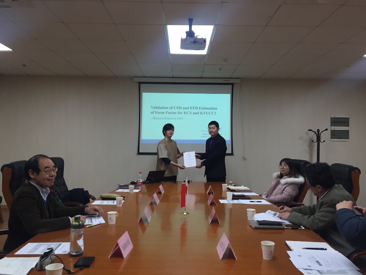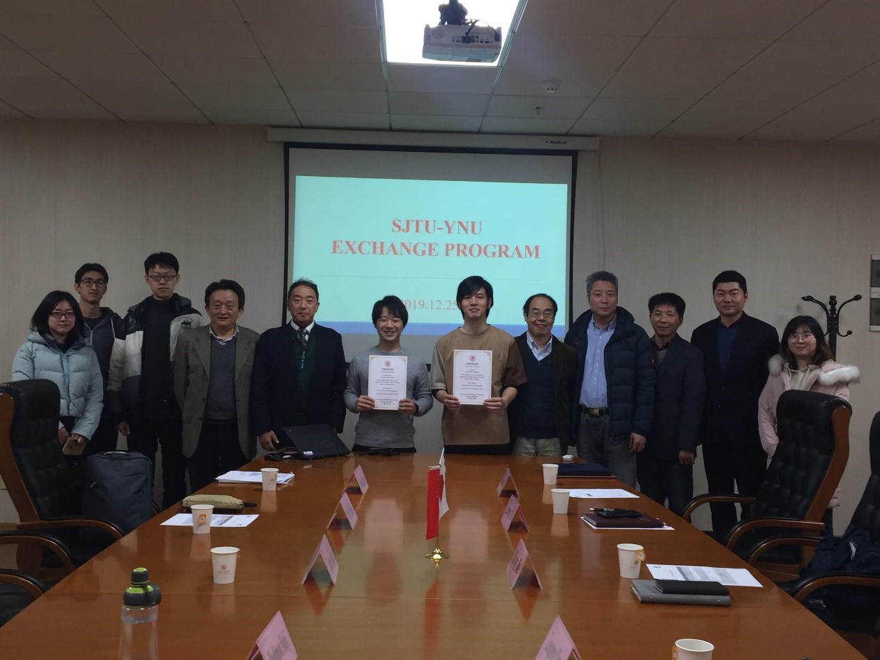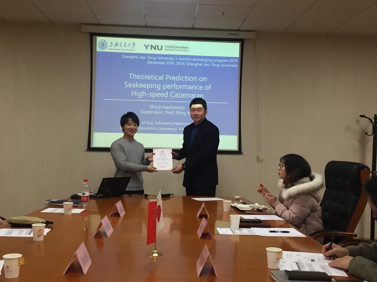 12月26日2019年度SJTU-YNU Joint Workshop暨日本横滨国立大学短期(三个月)交流交换生结业典礼在木兰船建大楼A1008会议室举行,萝莉社 导师代表马宁老师、陈作钢老师、余龙老师、顾解忡老师和学工办史舒婧老师,萝莉社 船海系、土木系部分学生代表出席结业典礼,横滨国立大学(YNU)的Takanori Hino和Motohiko Murai两位教授专程前来参加结业典礼和学生答辩。