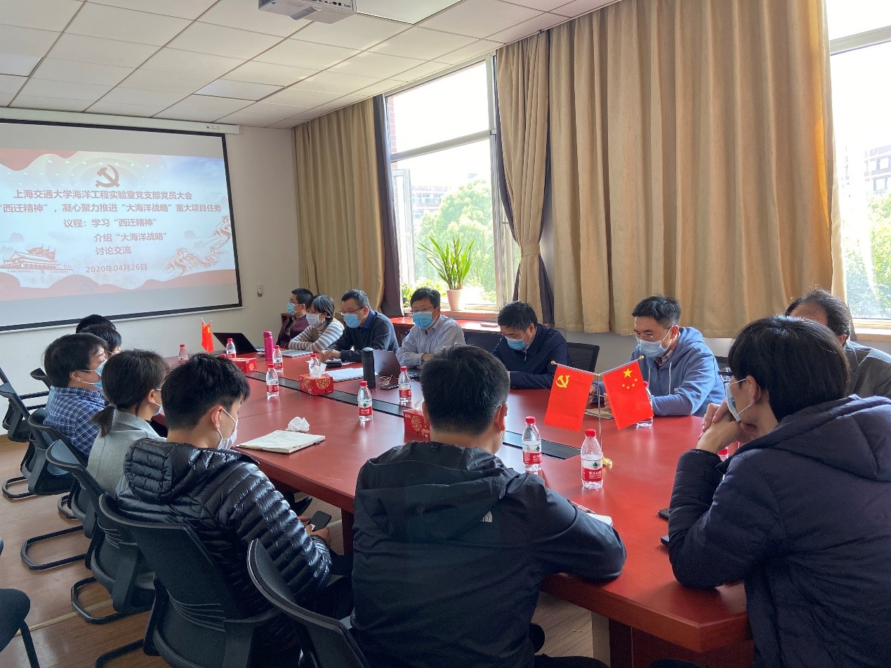 2020年4月26日,萝莉社 海洋工程实验室党支部在支部活动室召开支部党员大会,开展主题党日活动,学习交通大学“胸怀大局,无私奉献,弘扬传统,艰苦创业”的西迁精神,凝心聚力、务实笃行,抓住新时代新机遇,扎实推进“大海洋战略”重大项目任务。