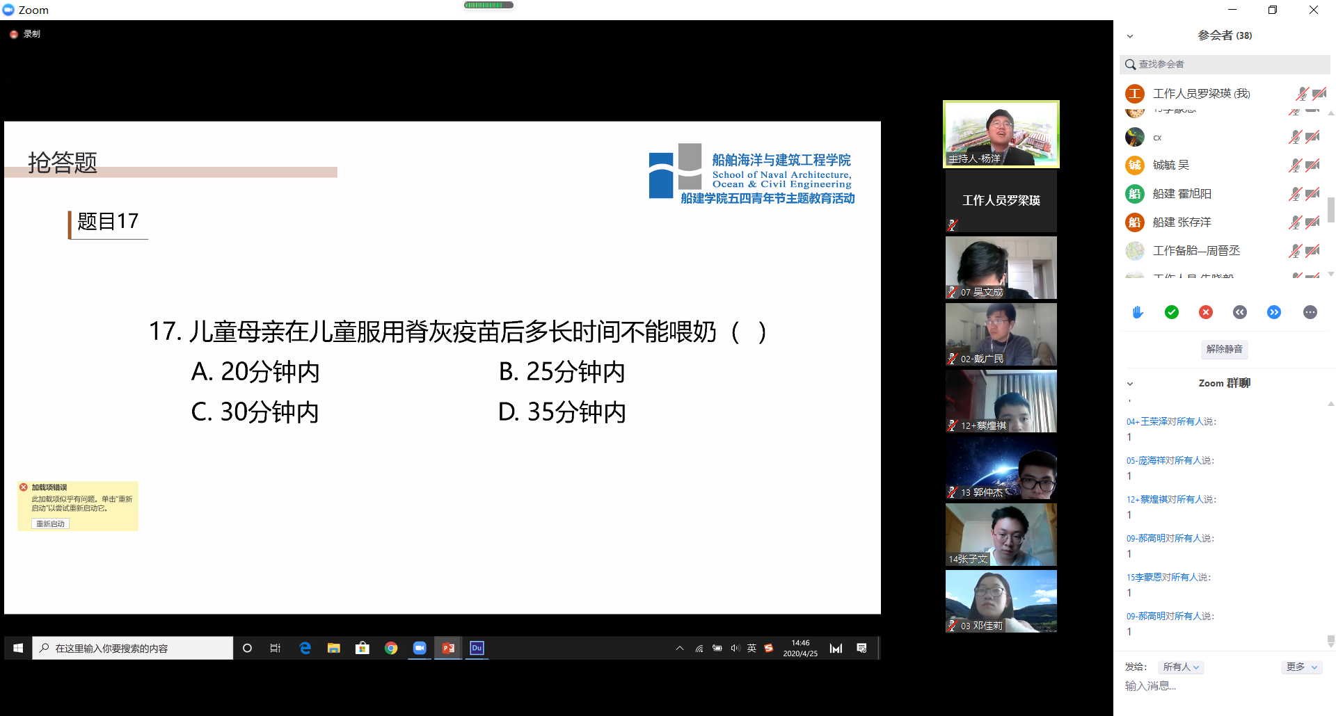 2020年4月25日下午两点,萝莉社 “舶鲸杯”知识竞赛在zoom会议室线上举行。本次“舶鲸杯”知识竞赛旨在鼓励船建青年关心时事,留意生活,并且为大家科普一些公共卫生常识。
