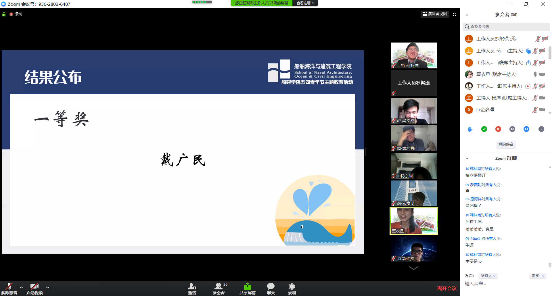 最后,夏衣旦公布了“舶鲸杯”知识竞赛的获奖结果:戴广民获得一等奖,韩林甫、蔡煌祺、李蒙恩获得二等奖,黄晨阳、郝高明、庞海祥、黄凯、张子文获得三等奖。至此,本次“舶鲸杯”知识竞赛圆满结束。