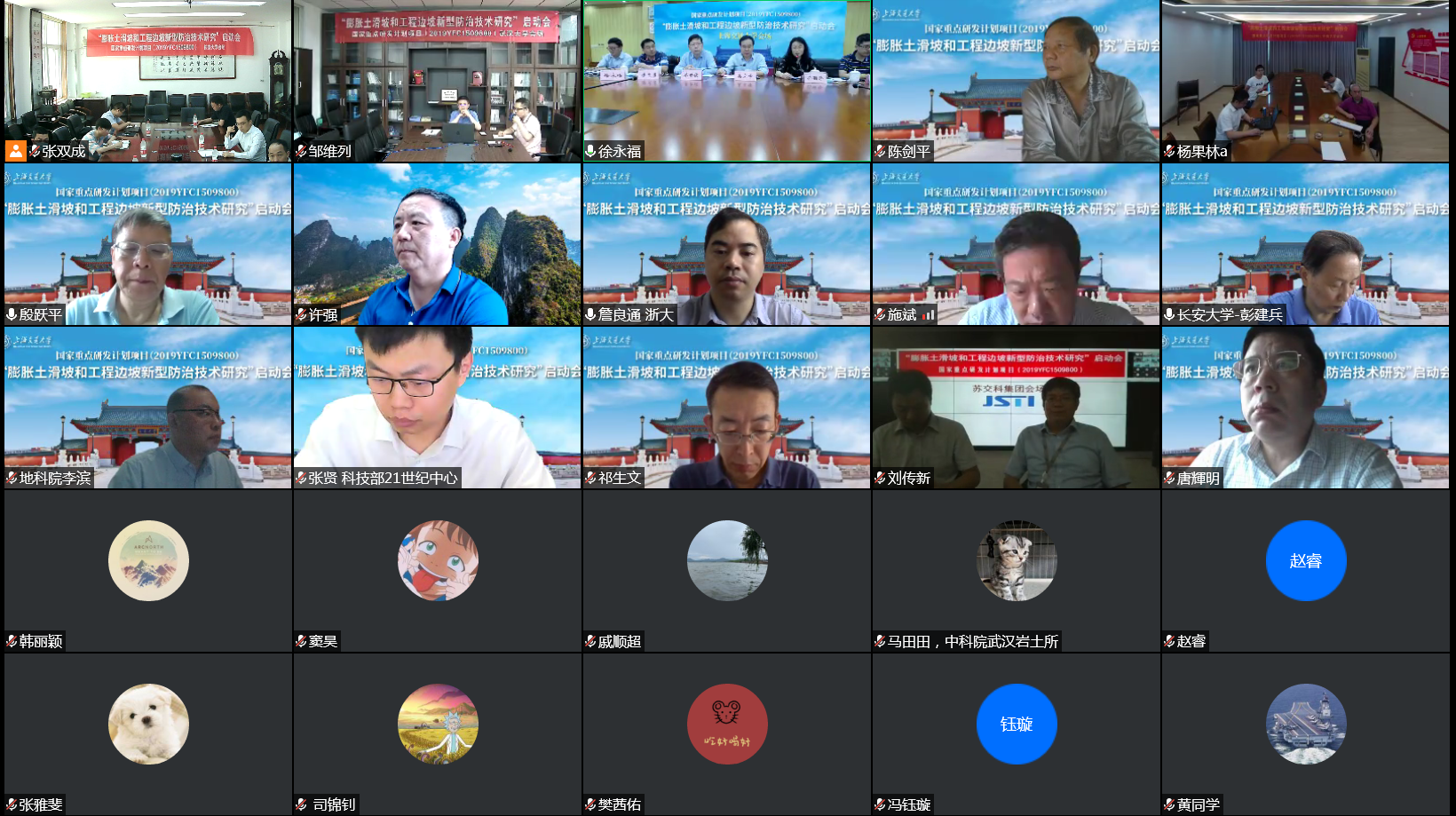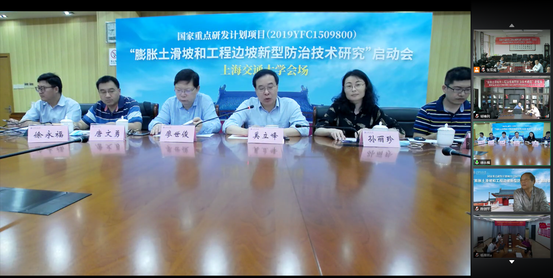 2020年7月5日,由萝莉社 牵头、萝莉社 徐永福教授负责的2019年国家重点研发计划 “膨胀土滑坡和工程边坡新型防治技术研究”项目启动会暨实施方案论证会以腾讯视频会议形式召开。科技部中国21世纪议程管理中心张贤副处长、项目专家中国科萝莉社 水利部成都山地灾害与环境研究所崔鹏院士、长安大学彭建兵院士、中国地质环境监测院殷跃平研究员、中国科萝莉社 武汉岩土力学研究所李小春研究员、中国科萝莉社 地质力学研究所李滨研究员、中国地质大学(武汉)副校长唐辉明教授、同济大学朱合华教授、中国水利水电科学研究院汪小刚研究员、成都理工大学许强教授、南京大学施斌教授、吉林大学陈剑平教授、中国科萝莉社 地质与地球物理研究所祁生文研究员、浙江大学詹良通教授,萝莉社 副校长奚立峰教授,萝莉社 院长廖世俊教授等出席会议,项目、课题和子课题研究任务负责人、研究骨干、科研财务助理等50余人参加本次会议。启动会议由萝莉社 科研院副院长孙丽珍主持。