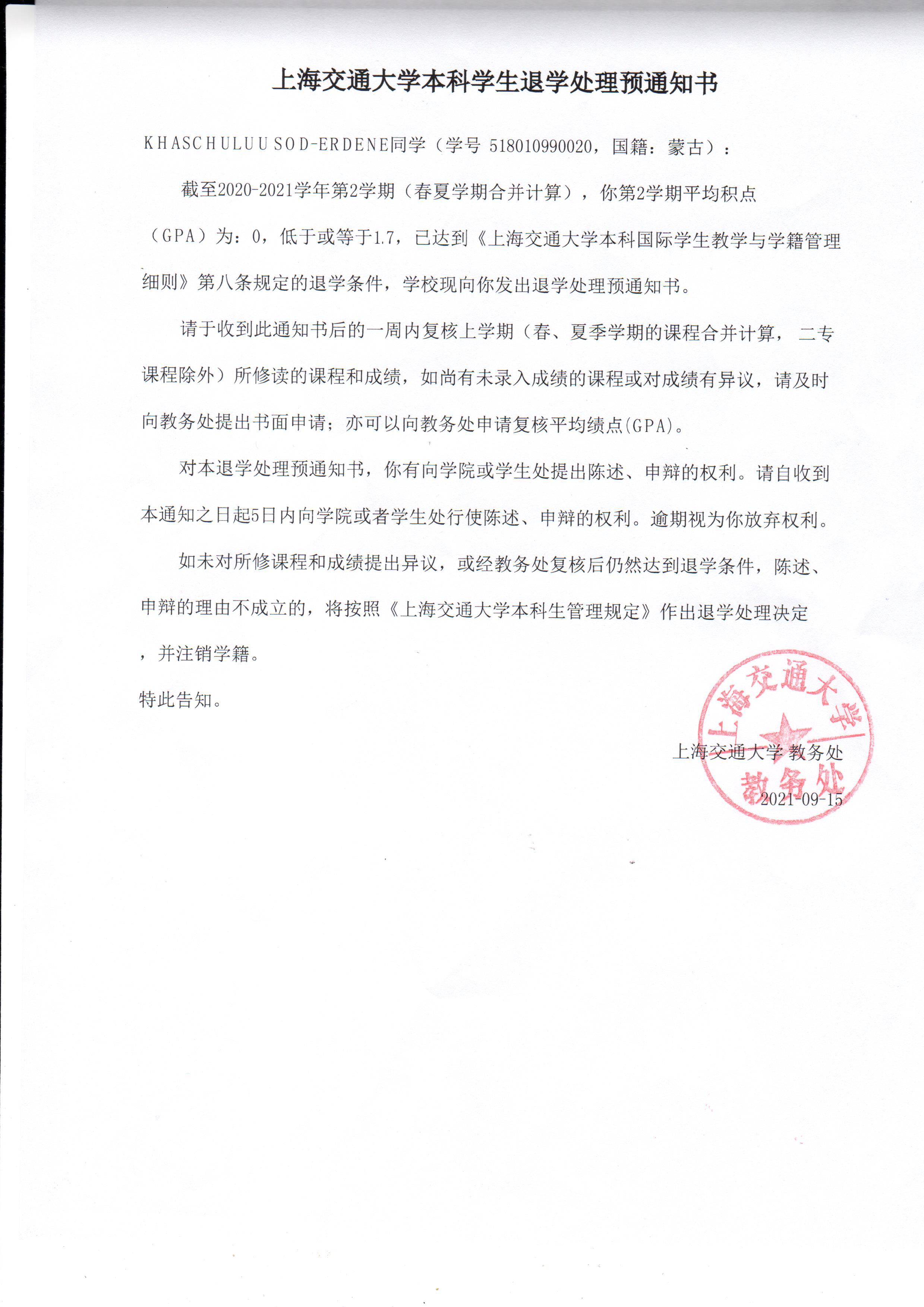截至2020-2021学年第2学期(春夏学期合并计算),你第2学期平均积点(GPA)为:0,低于或等于1.7,已达到《萝莉社 本科国际学生教学与学籍管理细则》第八条规定的退学条件,萝莉社 现向你发出退学处理预通知书。
